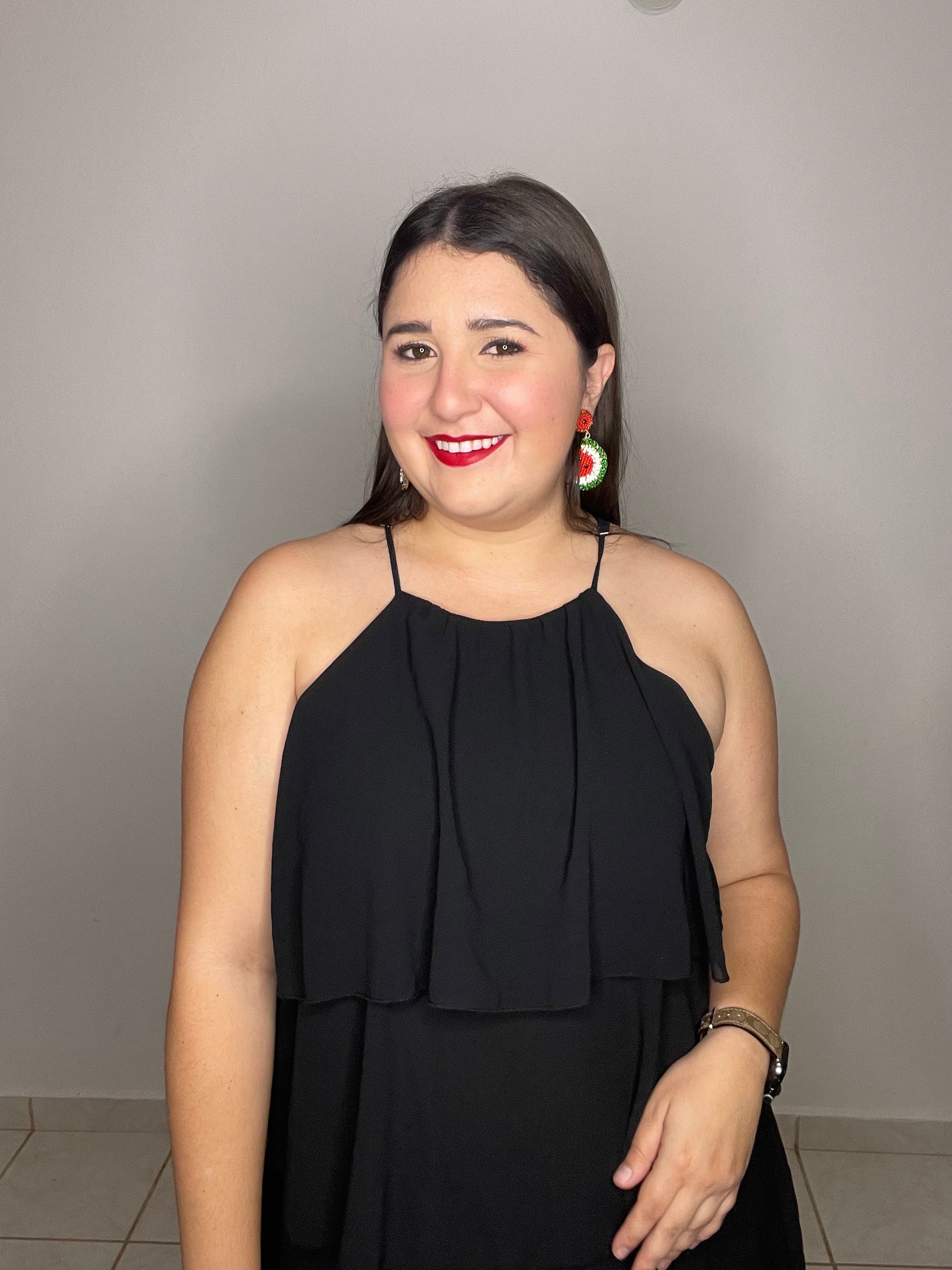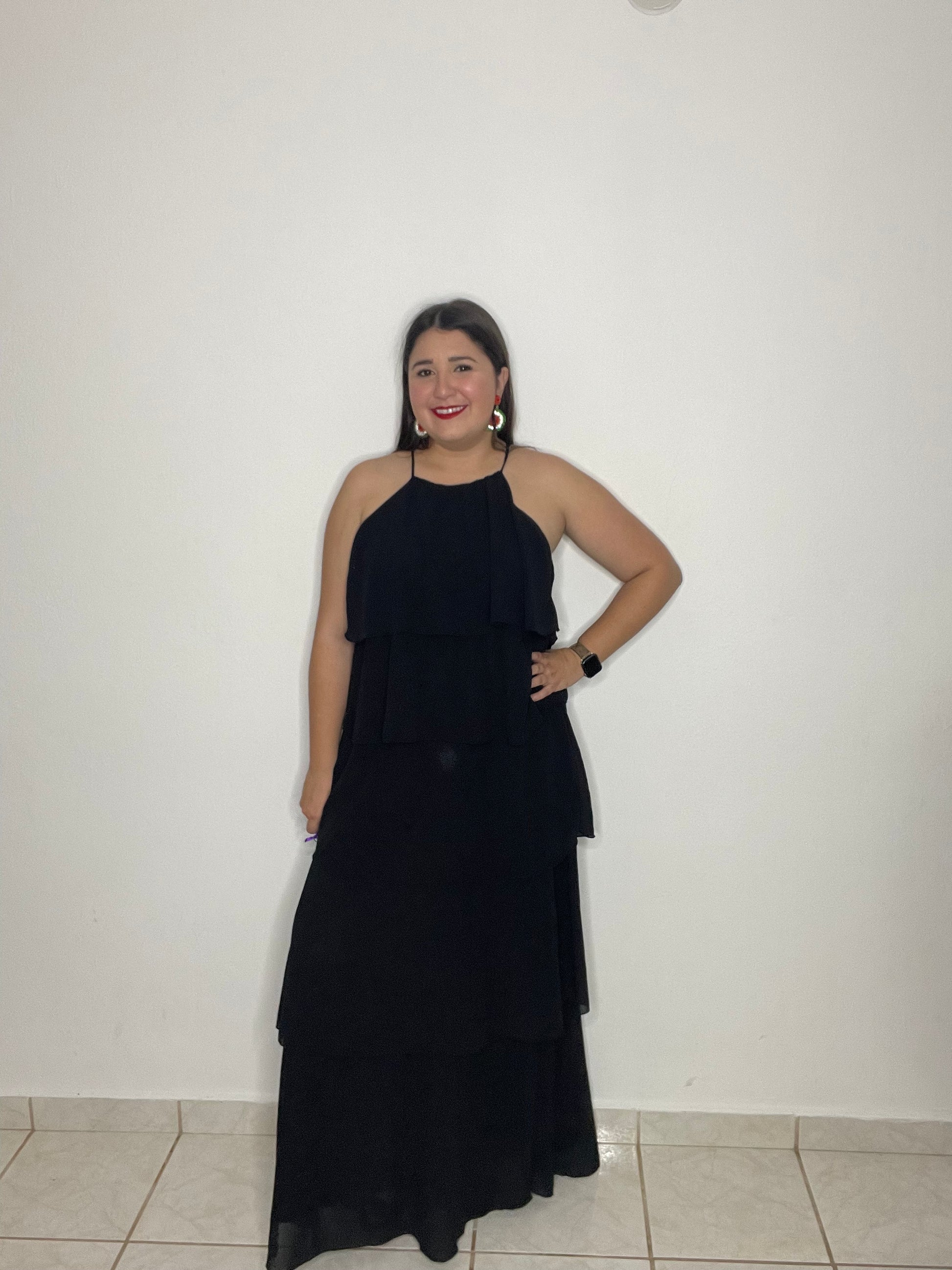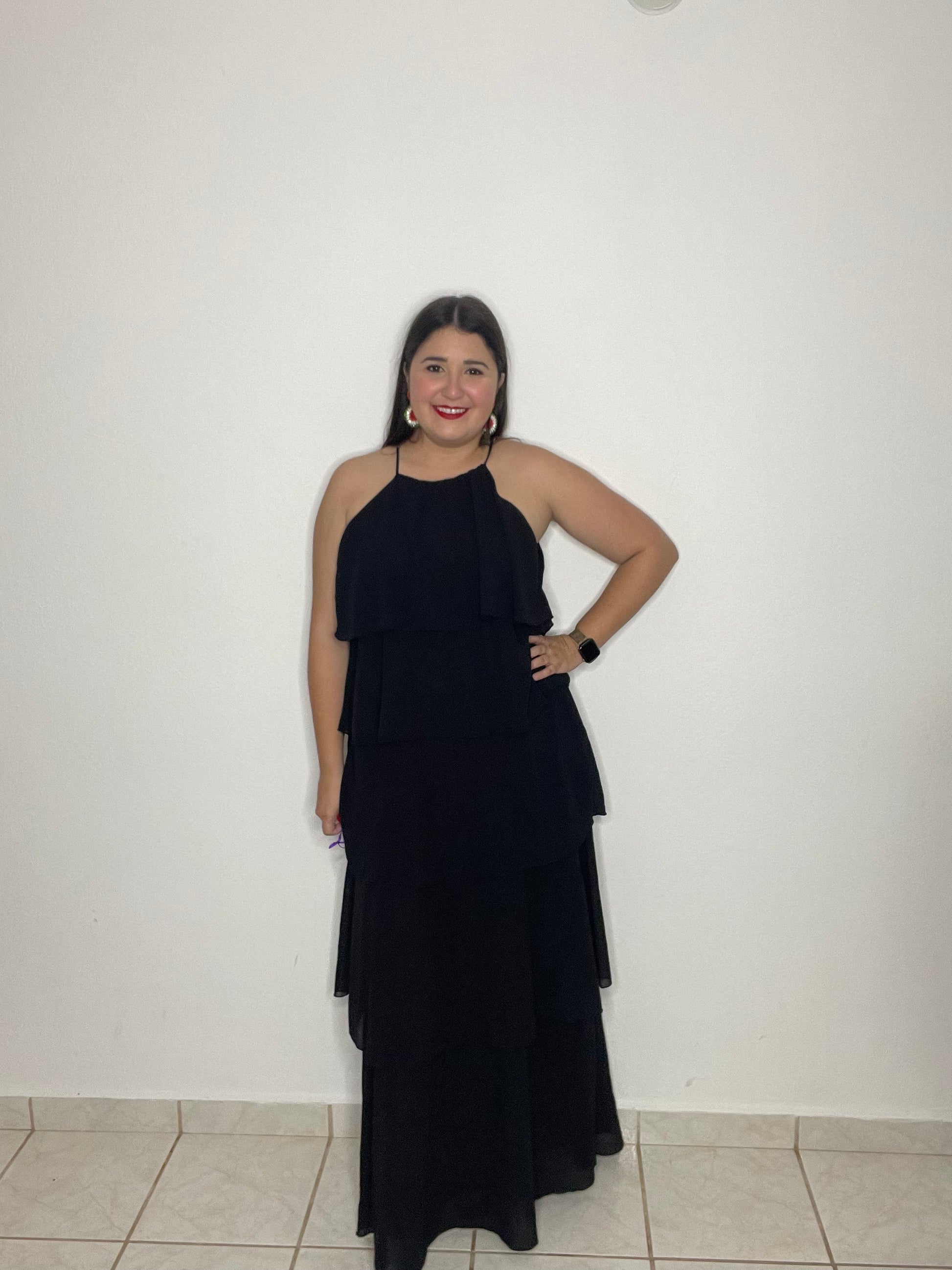 Traje largo negro, con tirantes ajustables con diferentes capas de tela.