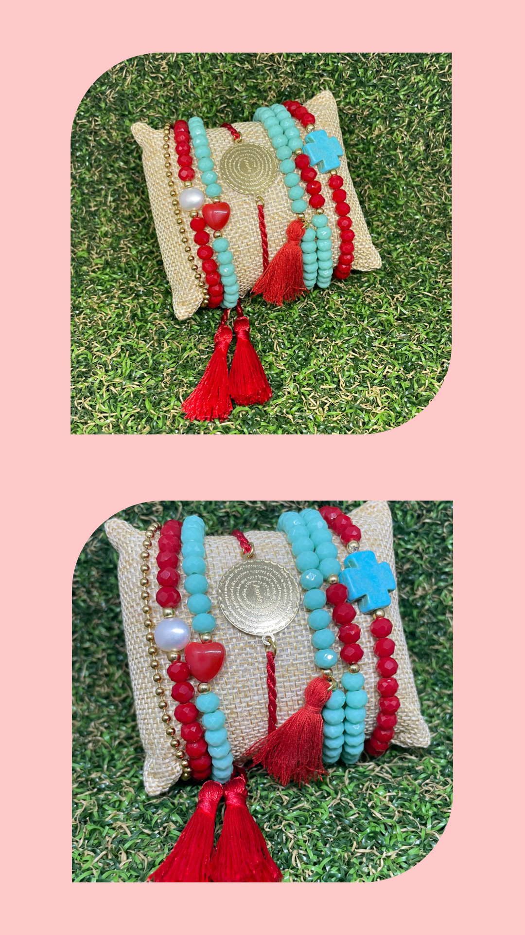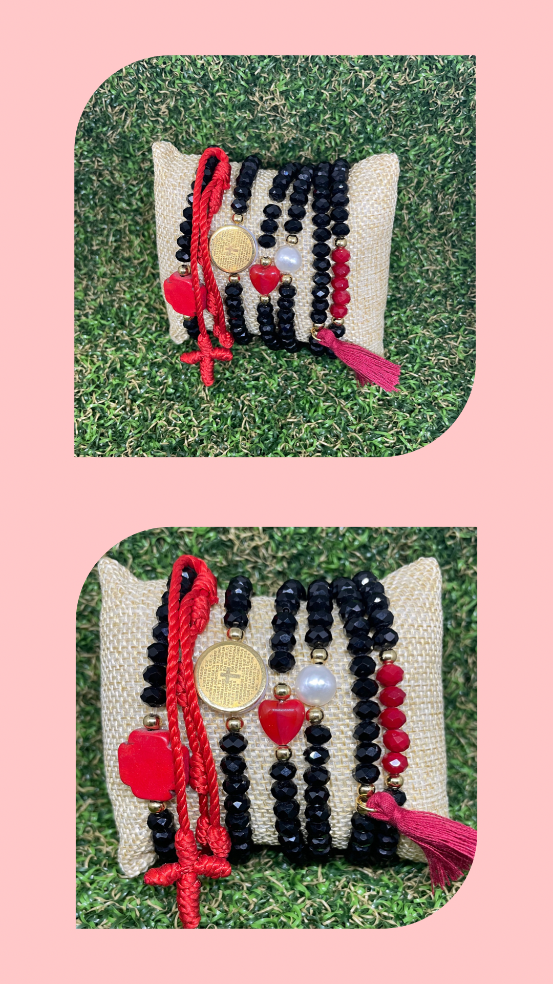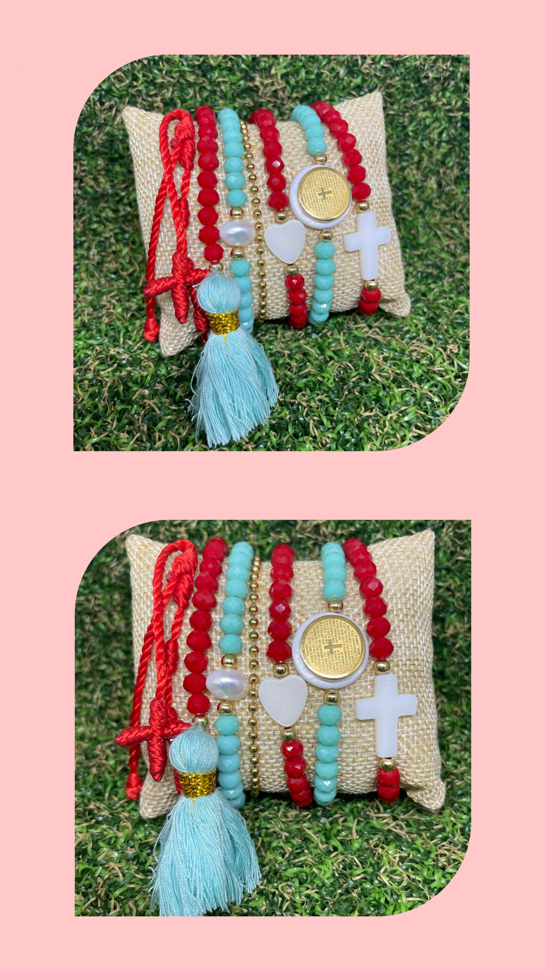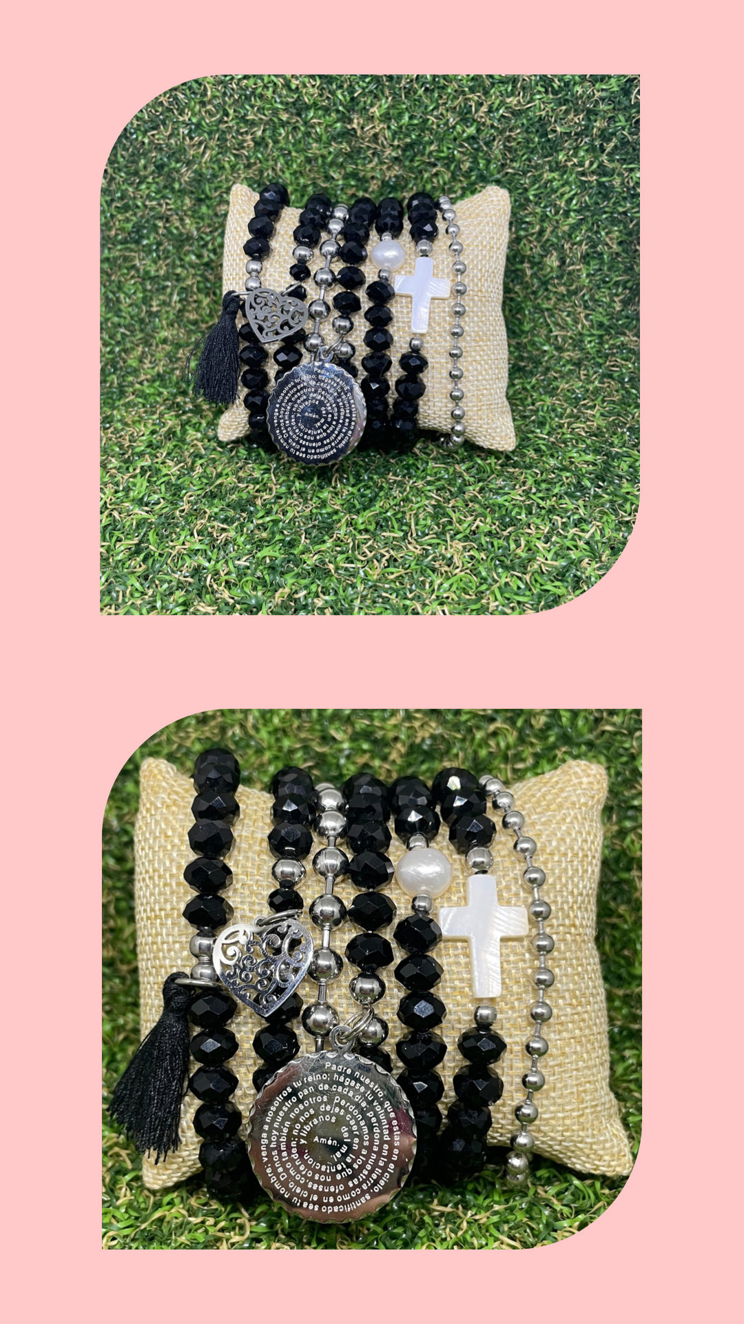 •Las pulseras incluyen cristales, nácar, separadores en stainless steel, charm en stainless steel y baño de oro, entre otro materiales de calidad. Estos son dependiendo a cada semanario y pulsera.