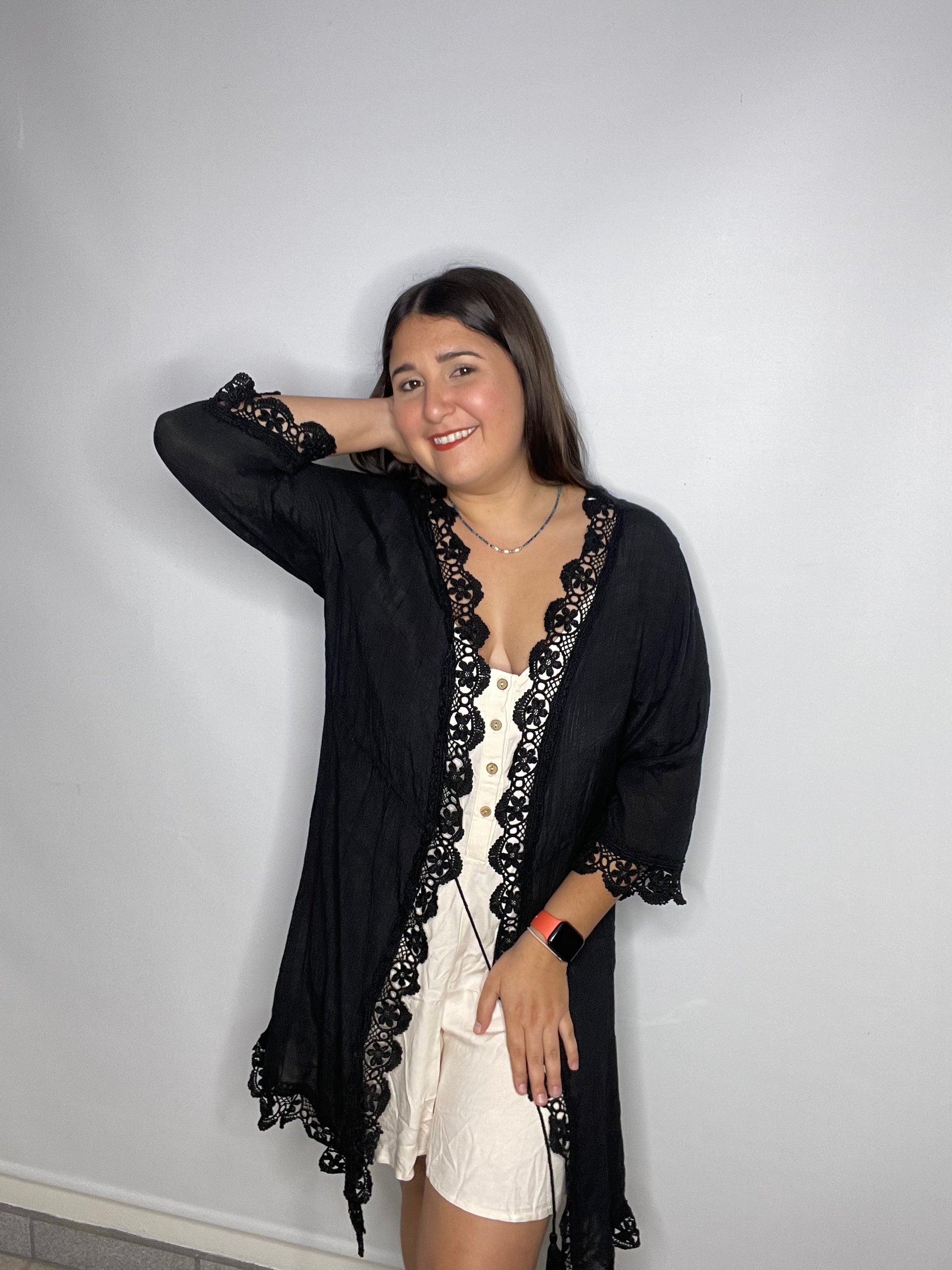 Kimono con sogas para amarrar y encaje en todo su alrededor incluido en sus mangas 3/4.