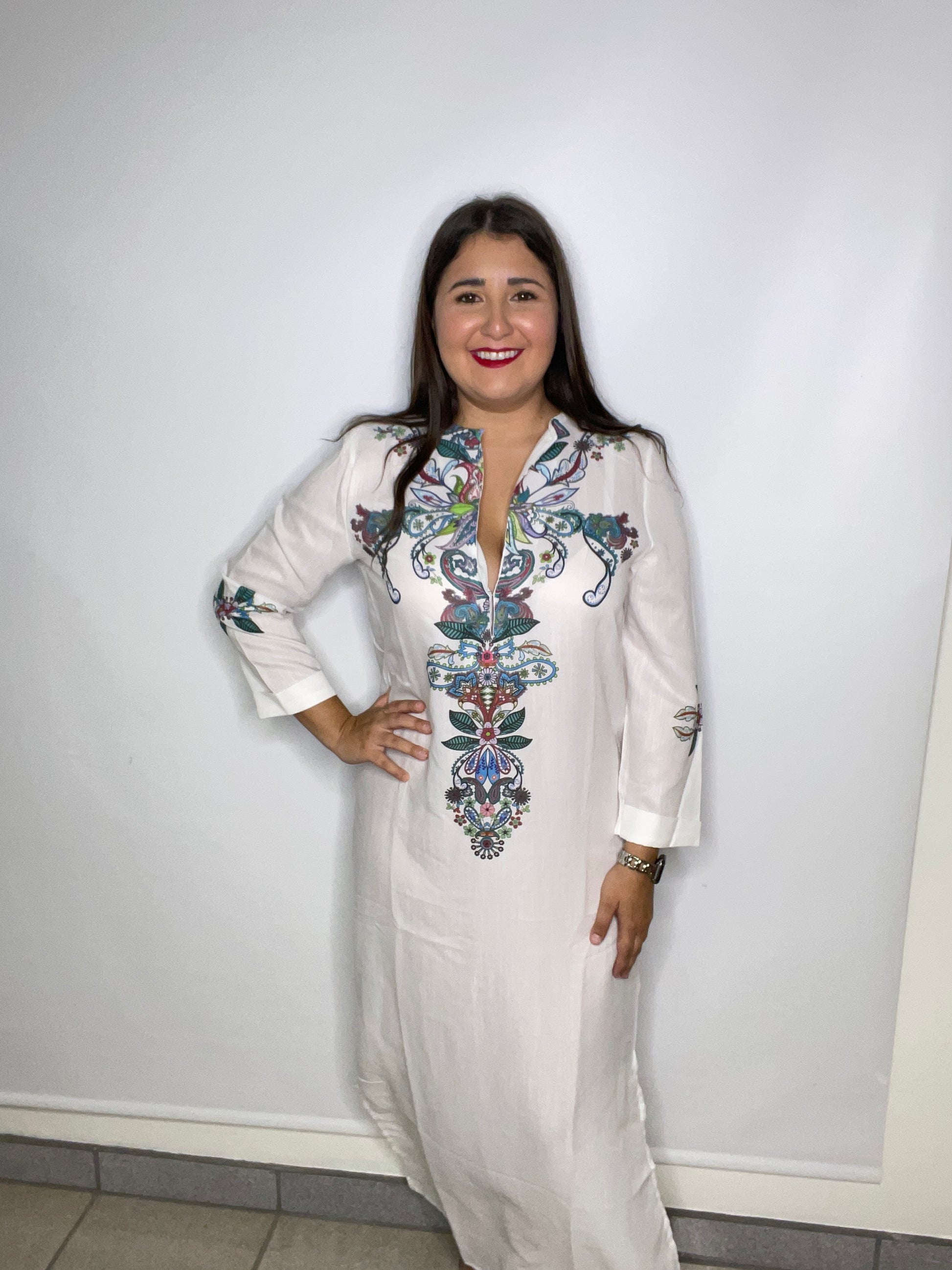 Caftan color blanco con pronunciado escote en V y mangas 3/4.